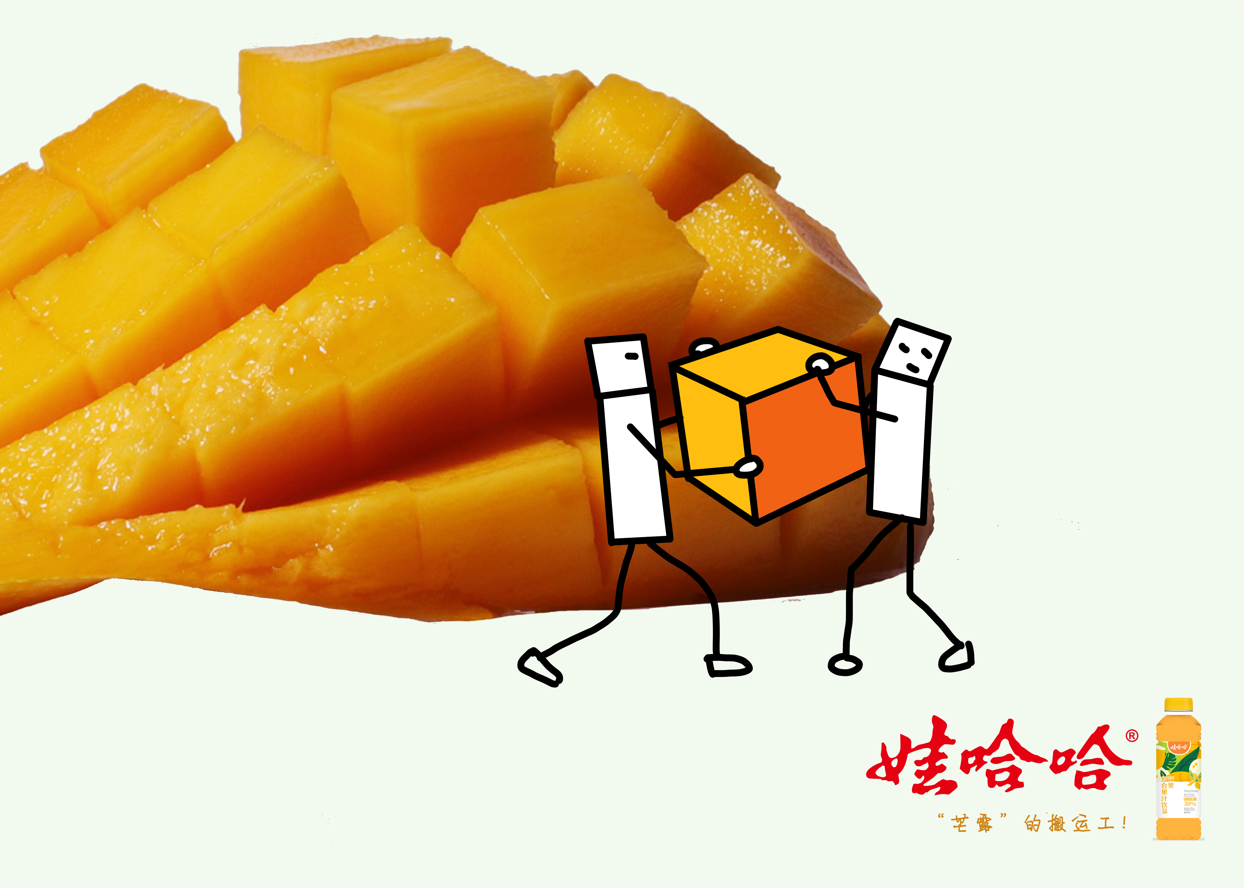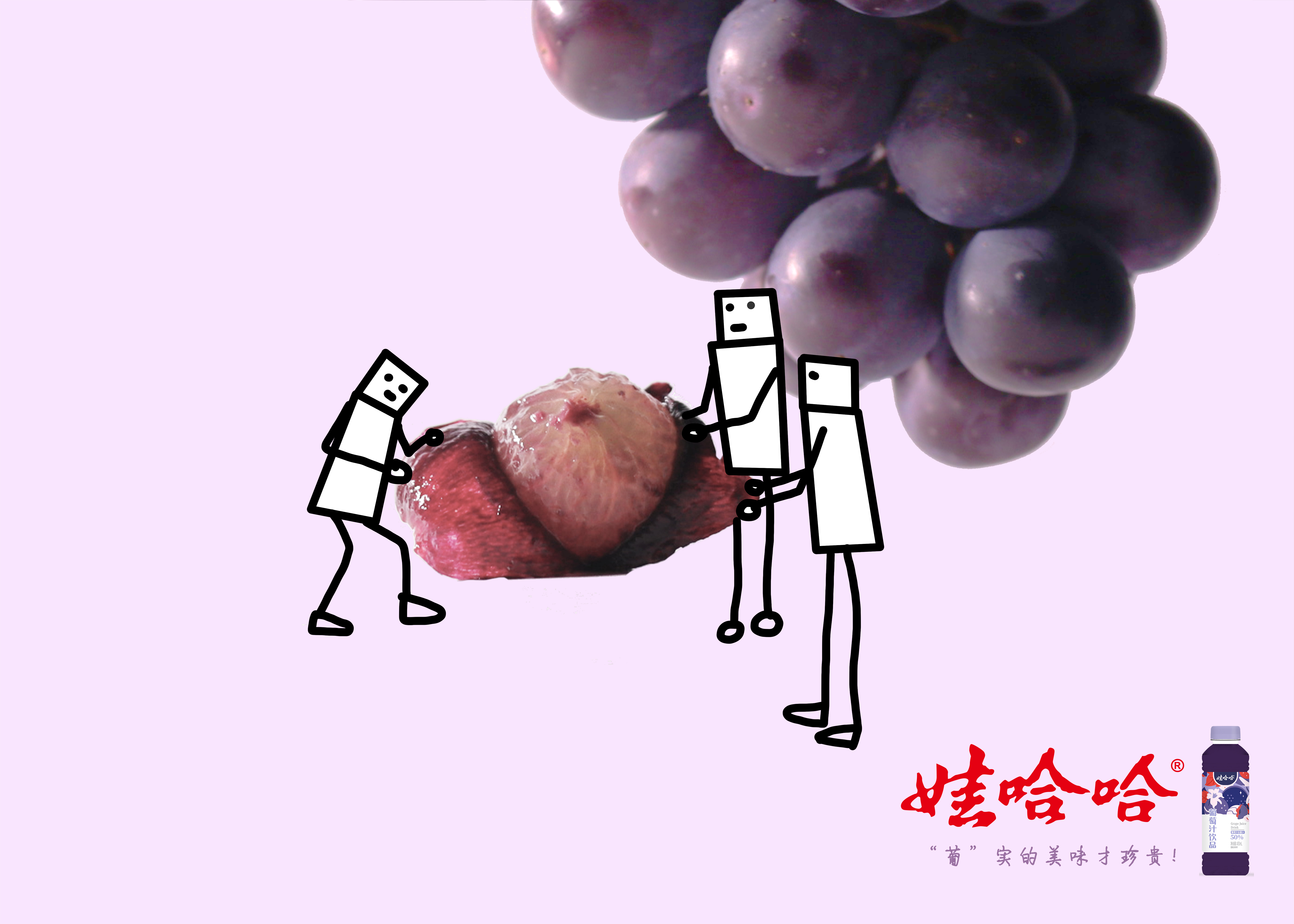 Advertisement for three flavors of Wahaha: Apple, Mango, Grape.