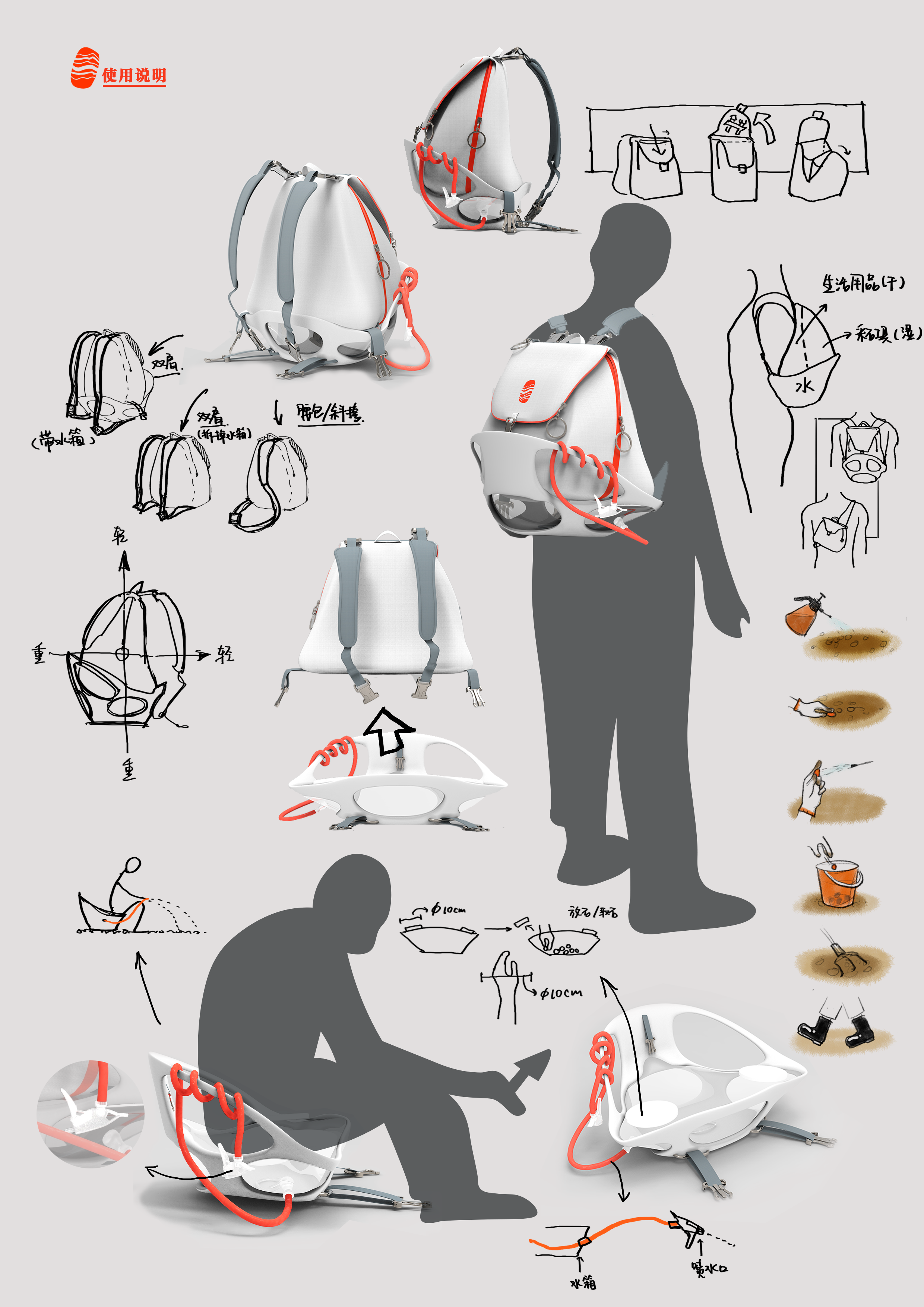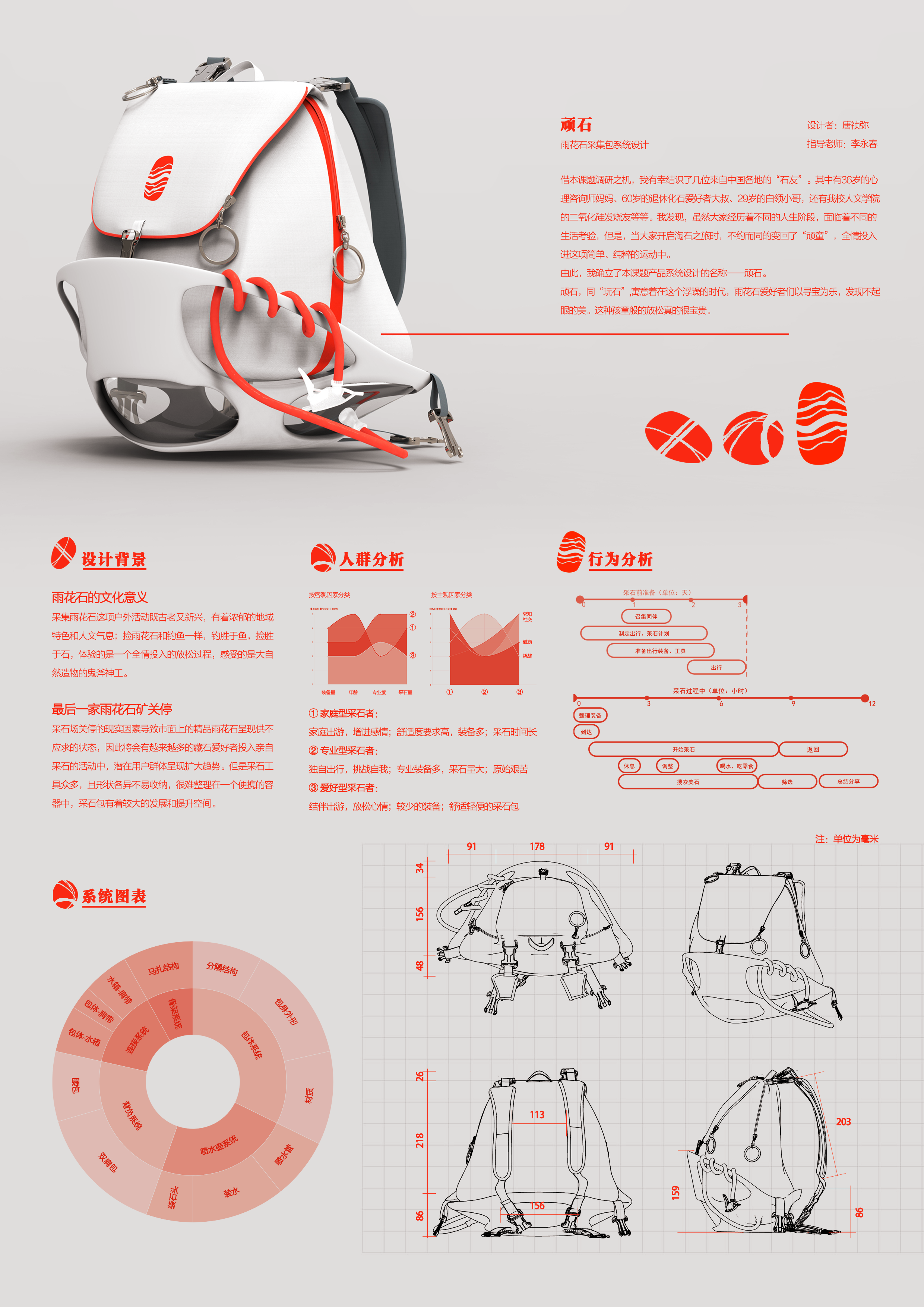 在淘石过程中,笔者发现了诸多不便之处,如水壶不易收纳、筛选石头过程过于粗放等等。因此,本人将本次产品系统设计的选题定为雨花石采集包的设计,想借此机会解决采石过程中的痛点,促进大众对雨花石的了解,吸引更多的雨花石爱好者入坑。
