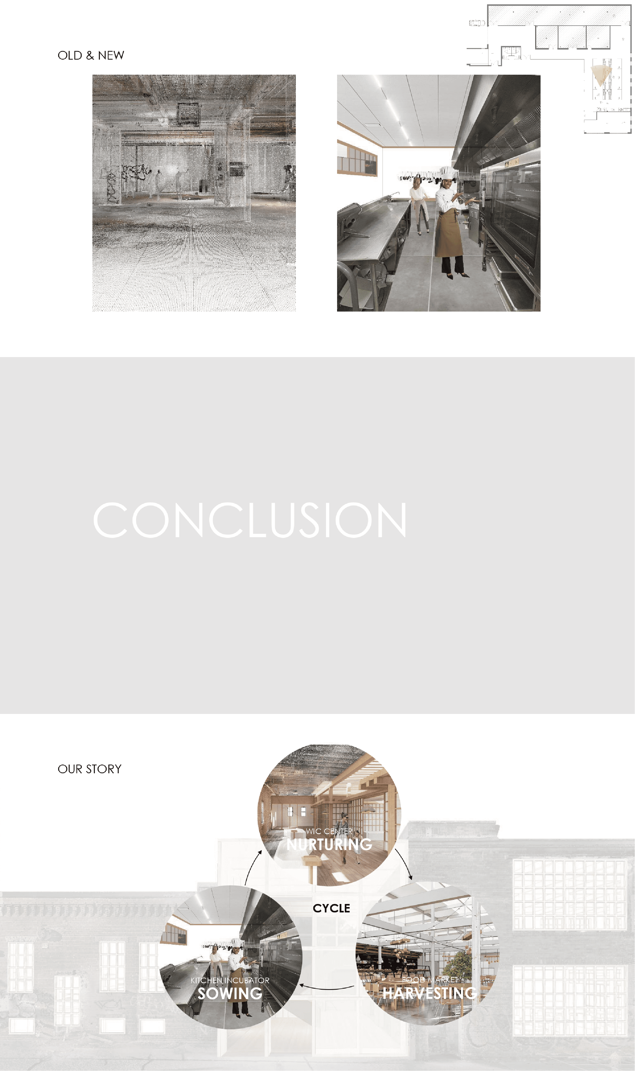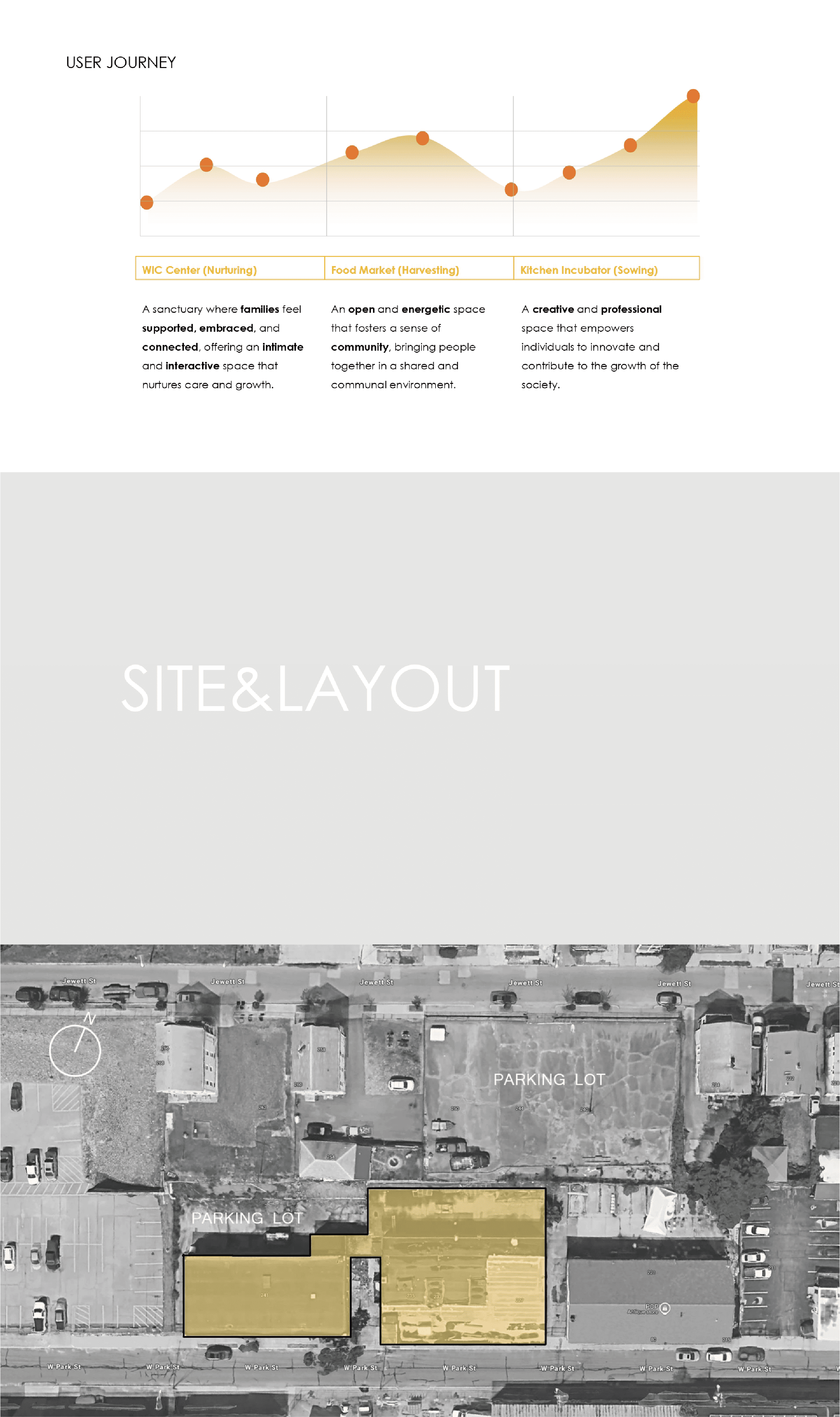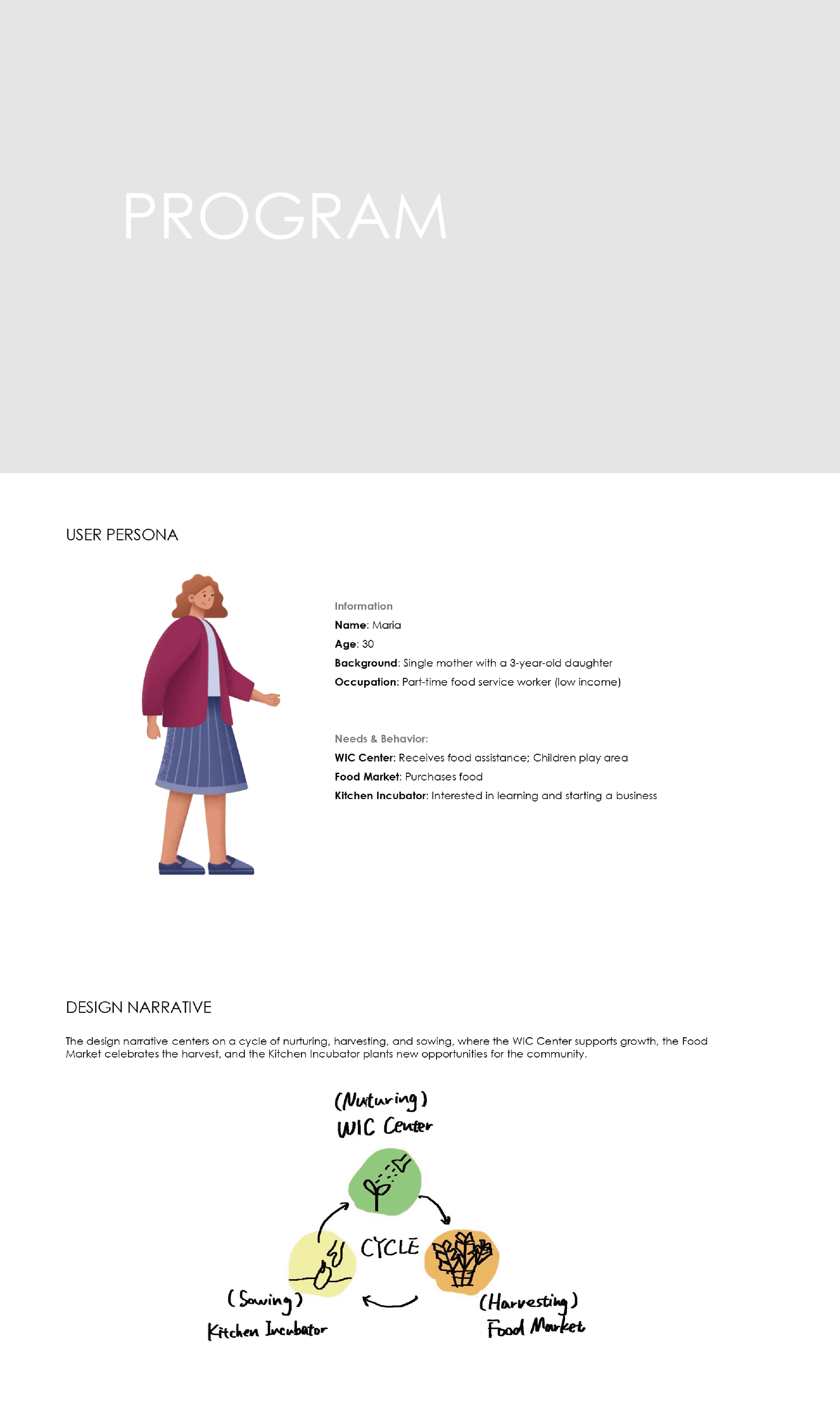 The design narrative revolves around a cycle of nurturing, harvesting, and sowing. The WIC Center fosters growth, the Food Market celebrates the harvest, and the Kitchen Incubator plants new opportunities for the community.