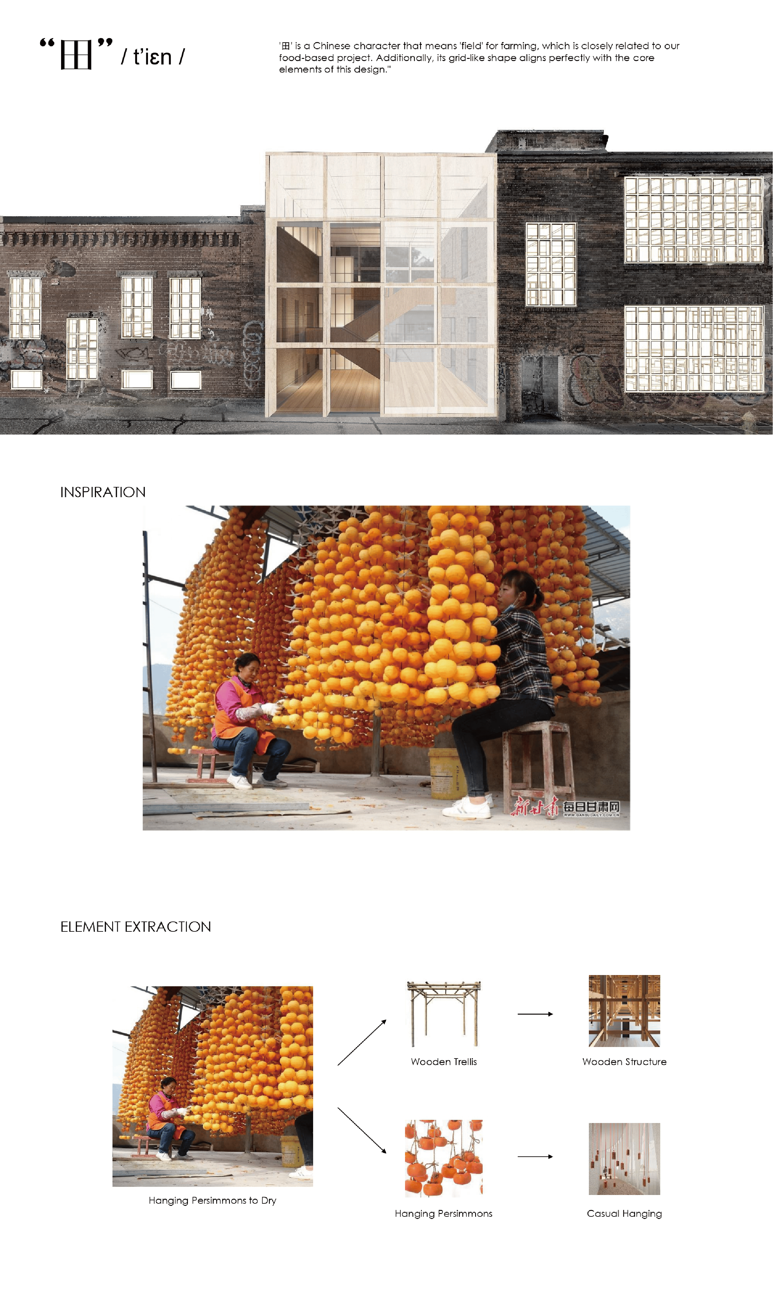 '田' is a Chinese character meaning 'field,' symbolizing farming and directly connecting to our food-based project. Its grid-like shape also reflects the structural elements in the design. This project draws inspiration from hanging persimmons and integrates existing structures through the use of point cloud technology.
